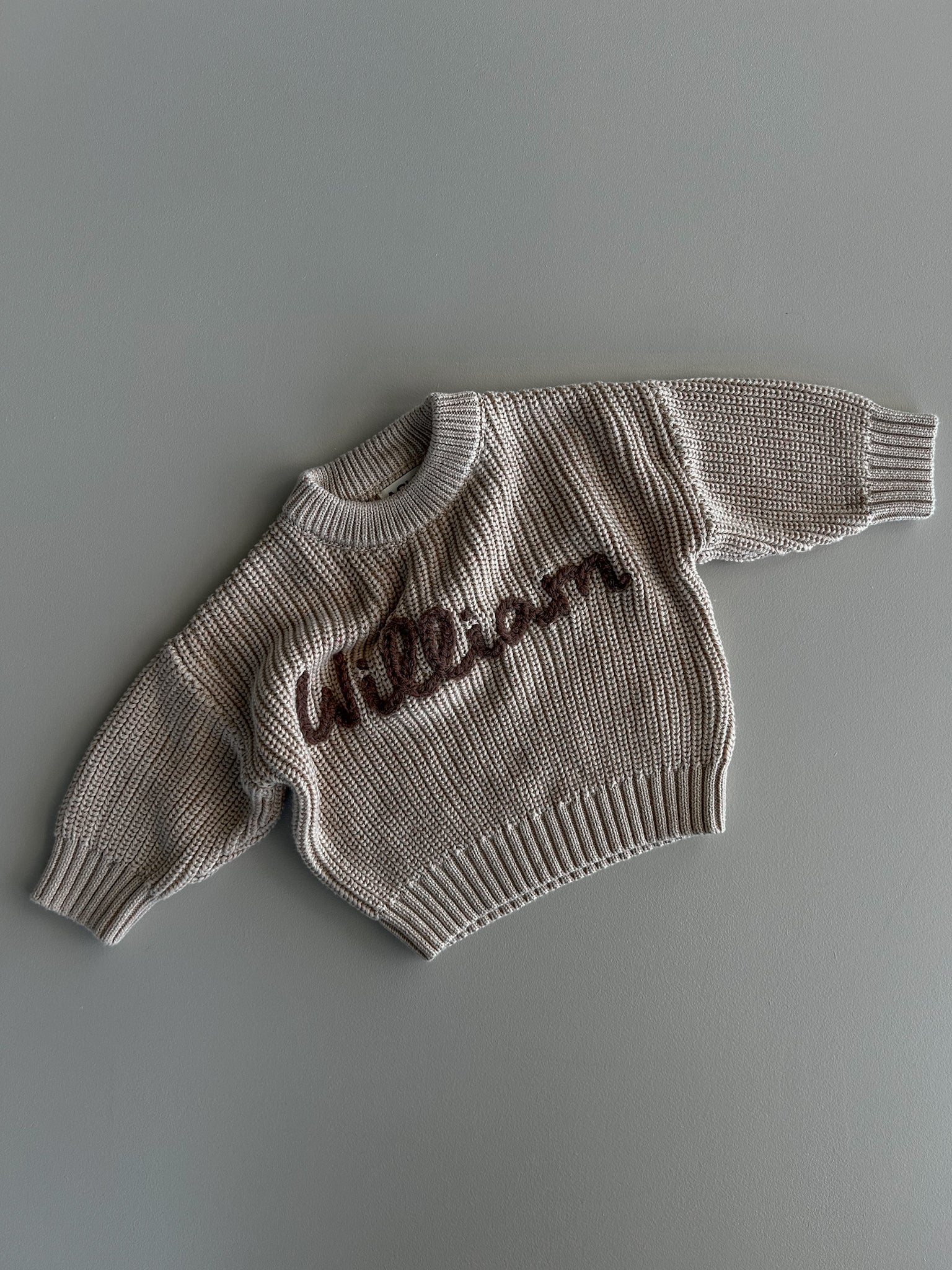 Each sweater is hand embroidered and can be personalised with a name, initial, nickname, or announcement e.g. Big Sister, with optional floral or bee embellishments.