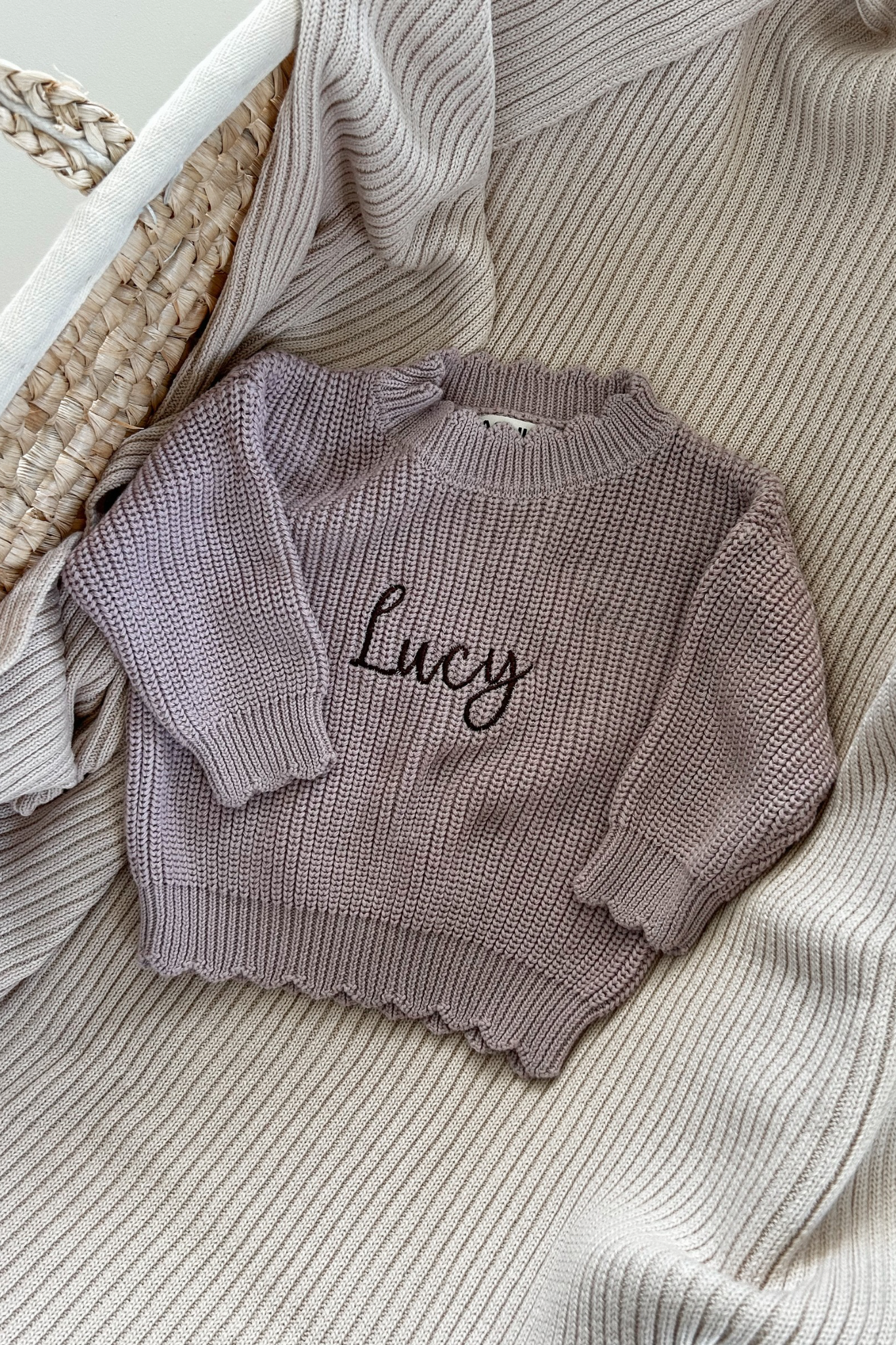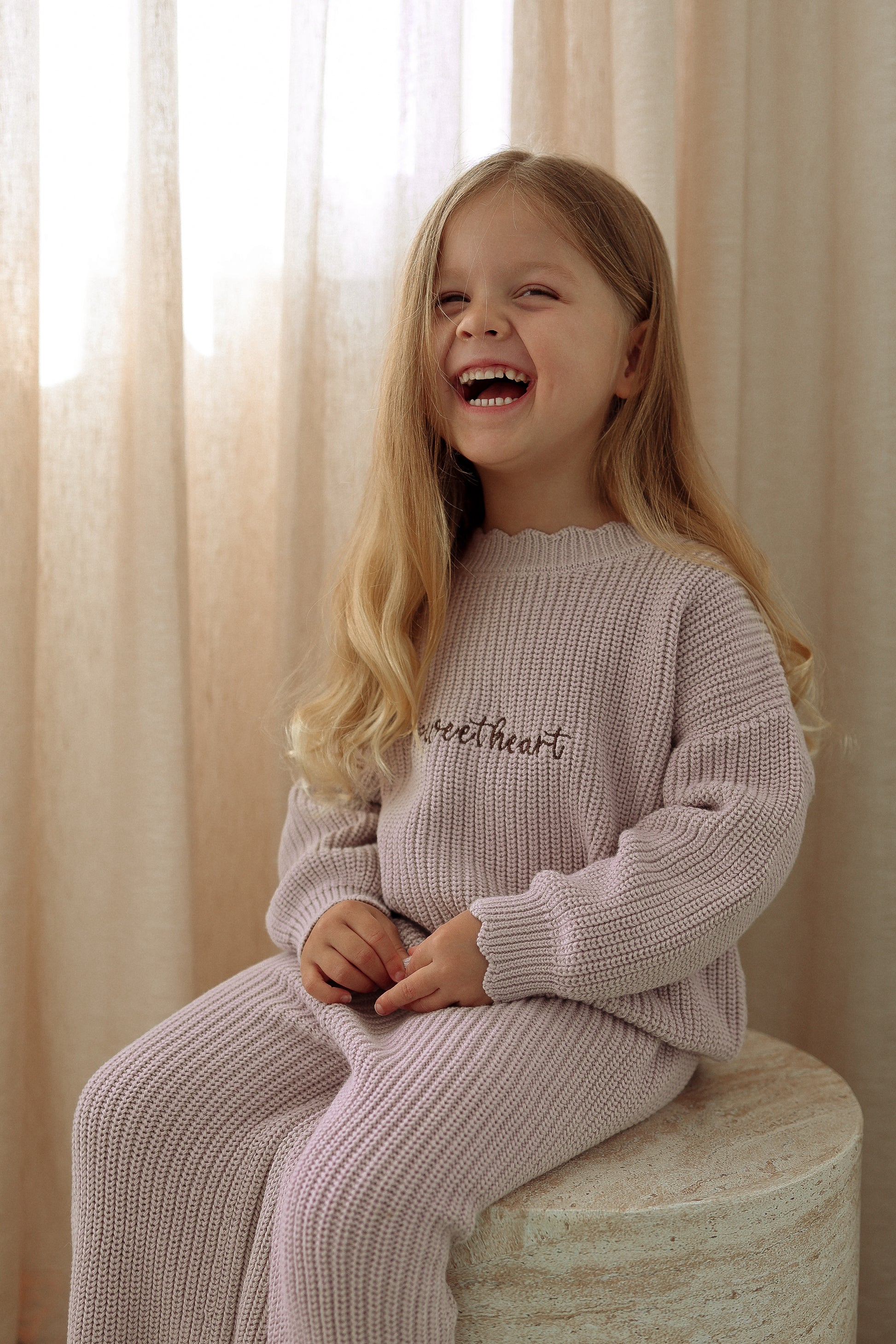 Our Sunday Knit Sweaters are made from a beautiful soft cotton, the perfect addition to your little ones wardrobe for any occasion. Featuring gorgeous scalloped hems on all her edges, she is the most stunning piece. Pair her with our matching Stormi wide leg pants, beanie and booties for the perfect matching outfit.